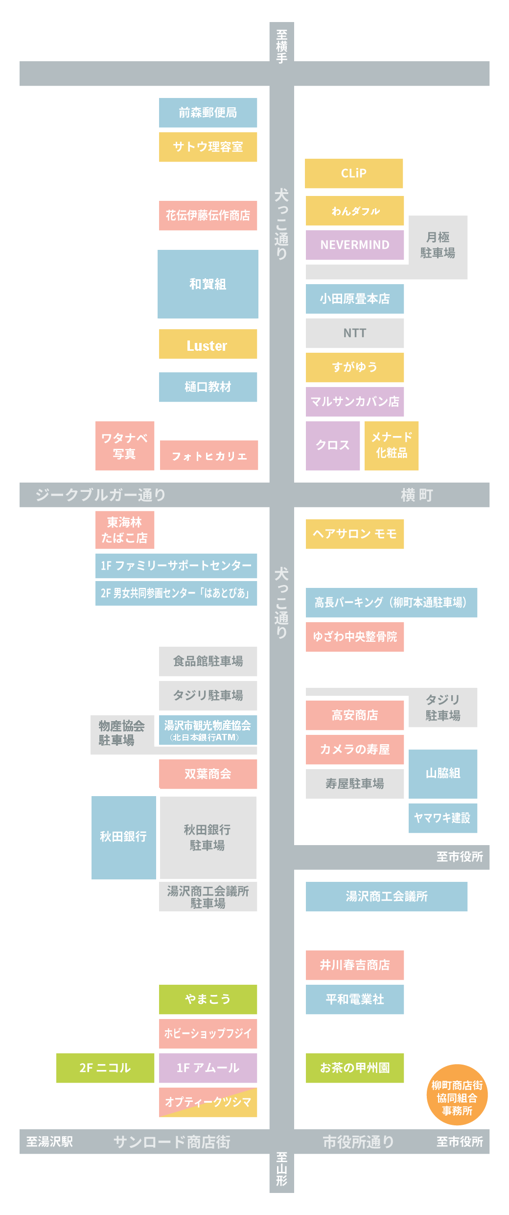 前森郵便局 CLiP サトウ理容室 花伝伊藤伝作商店 株式会社和賀組 樋口教材 ワタナベ写真 フォトヒカリエ NEVERMIND 小田原 すがゆう マルサンカバン店 クロス メナード化粧品 東海林たばこ店 1Fファミリーサポートセンター 2F男女共同参画センター「はあとぴあ」 湯沢市観光物産協会兼北日本銀行ATM 双葉商会 秋田銀行湯沢支店 やまこう ホビ-ショップ フジイ ニコル アムール オプティークツシマ ヘアサロン モモ 高長パーキング ゆざわ中央整骨院 高安商店 カメラの寿屋 山脇組 ヤマワキ建設 湯沢商工会議所 井川春吉商店 平和電業社 お茶の甲州園 柳町商店街協同組合 Luster